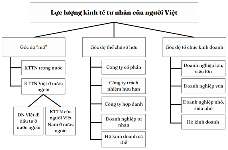 Đề tài nhấn mạnh: KTTN của người Việt Nam, hiểu cách tổng thể, là một bộ phận của nền kinh tế, được vận hành bởi các đơn vị kinh tế (ở trong và ngoài lãnh thổ Việt Nam) mà chủ thể là người Việt Nam (bao gồm công dân Việt Nam và người Việt Nam định cư ở nước ngoài có quan hệ kinh tế với đất nước – Đề tài gọi tắt là kinh tế tư nhân Việt kiều), đại diện cho sở hữu tư nhân (hoặc hộ kinh doanh cá thể) thực hiện kinh doanh vì lợi nhuận và các mục tiêu xã hội khác. Còn lực lượng kinh tế tư nhân của người Việt Nam được hiểu là một tổng thể cấu trúc các loại hình kinh tế tư nhân của người Việt Nam, trong đó mỗi bộ phận được xác định trong mối quan hệ với các bộ phận khác và với tổng thể hệ thống, tạo thành nền tảng của nền kinh tế thị trường ở Việt Nam. Những điểm nhấn của quan điểm: (i) Trong lực lượng kinh tế tư nhân Việt Nam, vai trò và chức năng của mỗi thành tố được xác định trong mối liên hệ với các thành tố khác và với tổng thể - hệ thống, theo đó, các tập đoàn kinh tế (doanh nghiệp lớn và siêu lớn) đóng vai trò “trụ cột”, làm trục liên kết các doanh nghiệp nhỏ và vừa, tạo thành “chuỗi”, “mạng” sản xuất Việt Nam; (ii) Trong thành tố cấu thành lực lượng kinh tế tư nhân, cần lưu ý bộ phận kinh tế tư nhân Việt Nam ở nước ngoài, bao gồm các doanh nghiệp đầu tư ra nước ngoài và kinh tế tư nhân của người Việt Nam đang định cư ở nước ngoài có quan hệ kinh tế với đất nước.