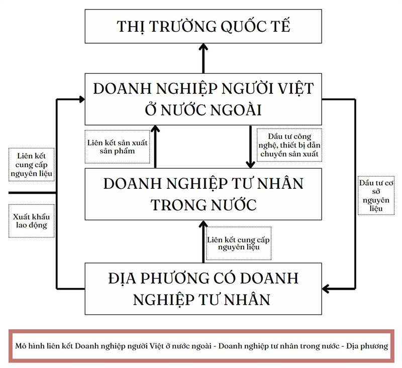 Theo mô hình này, doanh nghiệp tư nhân của người Việt Nam ở nước ngoài có lợi thế về thị trường tiêu thụ sản phẩm, về các điều kiện vốn đầu tư, công nghệ và thiết bị sản xuất kinh doanh hiện đại, trong khi đó các doanh nghiệp này lại khó khăn về cơ sở nguyên liệu, cơ sở sản xuất hoặc lực lượng lao động. Ngược lại, doanh nghiệp tư nhân trong nước và địa phương lại có các lợi thế trên. Nếu liên kết được hai bộ phận này với nhau thì lực lượng kinh tế tư nhân của người Việt Nam sẽ có cơ hội được lớn mạnh thêm.