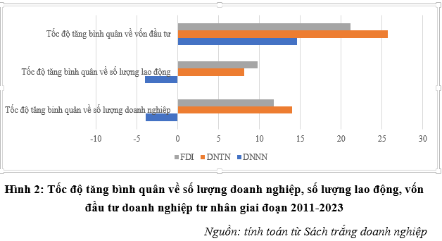 Nếu xem xét quy mô nền kinh tế ở góc độ sự gia tăng nguồn lực, bình quân giai đoạn 2011-2023, khu vực KTTN Việt Nam có tốc độ tăng trưởng vượt trội so với các khu vực kinh tế khác về số lượng doanh nghiệp (bình quân năm đạt 14,7%, từ 2011 đến 2023, tăng 2,5 lần), quy mô vốn đầu tư (25,3%, từ 2011 đến 2023, tăng 4 lần) và và lực lượng lao động (8%, từ 2011 đến 2023 tăng 1,5 lần).