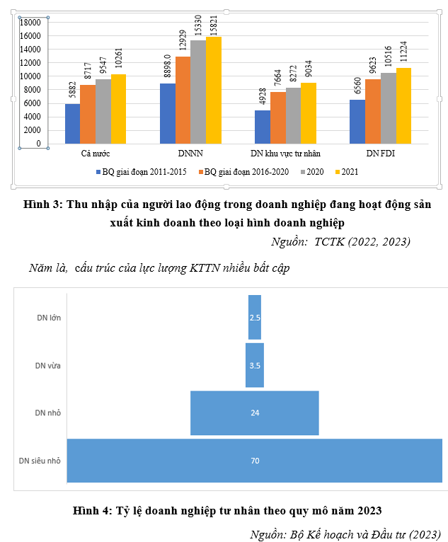 Hình 4 cho thấy: (i) Các DNTN quy mô lớn còn quá ít ỏi, làm hạn chế khả năng tận dụng lợi thế nhờ quy mô, không đủ tạo ra lực hút để thực hiện vai trò dẫn dắt toàn bộ lực lượng DNTN Việt Nam trong quỹ đạo phát triển của họ như các “sếu đầu đàn”; (ii) Doanh nghiệp quy mô vừa rất thiếu nên không thể đóng được vai trò trung gian giữa doanh nghiệp nhỏ và siêu nhỏ với doanh nghiệp lớn và ít có khả năng chuyển tiếp lên quy mô lớn; (iii) Các đơn vị KTTN còn lại không chỉ có quy mô nhỏ siêu nhỏ là chủ yếu (96%), thành phần chủ yếu là kinh tế cá thể (hộ kinh doanh), năng lực công nghệ yếu, chủ yếu sản phẩm sản xuất và kinh doanh nhỏ lẻ, rất khó có thể liên kết hay nhận sự hỗ trợ của các doanh nghiệp lớn hay tham gia vào mạng sản xuất và các chuỗi giá trị trong nước và toàn cầu.