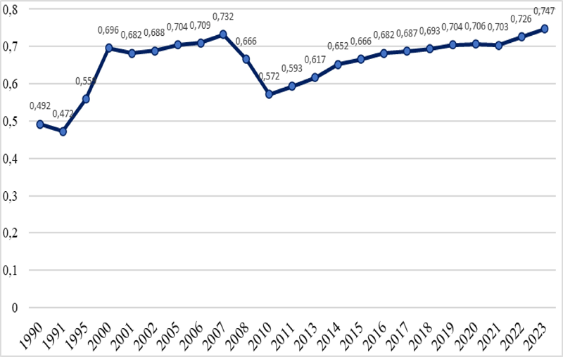 Biểu đồ 1: Chỉ số phát triển con người (HDI) của Việt Nam: 1990-2023