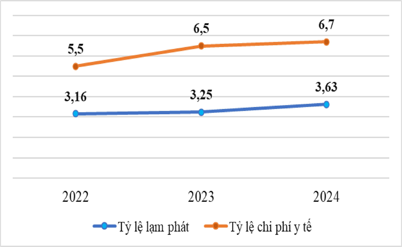 Tuy nhiên, bên cạnh những thành tựu đạt được, hệ thống y tế vẫn còn nhiều tồn tại, hạn chế cần được khắc phục. Ở góc nhìn vĩ mô, chi tiêu công cho y tế ở Việt Nam mới chỉ chiếm 3,7% GDP, thấp hơn nhiều so với mức trung bình 6,5% của các nước OECD (WHO, 2022). Đáng lưu ý, tỉ lệ chi tiền túi của người bệnh là 43%, cao hơn rất nhiều so với các quốc gia khác. Báo cáo Global Medical Trend Rates (2024) đánh giá xu hướng y tế toàn cầu qua các năm 2022, 2023, 2024 cho thấy, chi phí y tế tại Việt Nam liên tục tăng, tương ứng là 5,5%, 6,5% và 6,7% trong các năm nói trên. Tính trung bình trong 3 năm gần đây, tốc độ tăng chi phí y tế ở Việt Nam cao hơn và gấp 1,6 lần so với tỉ lệ lạm phát (Biểu đồ 3). So với khả năng chi trả, chi tiêu y tế là rất lớn và trở thành gánh nặng tài chính đối với xã hội.