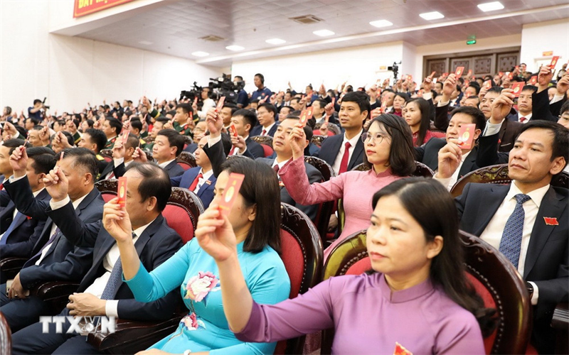 Các đại biểu biểu quyết thông qua dự thảo Nghị quyết Đại hội Đảng bộ tỉnh Ninh Bình nhiệm kỳ 2025-2030.
