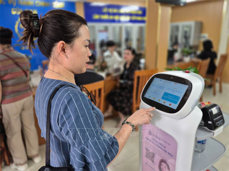 Người dân trải nghiệm robot AI áp dụng công nghệ trí tuệ nhân tạo hỗ trợ thực hiện các thủ tục hành chính tại phường Cửa Nam, thành phố Hà Nội. Ảnh minh họa: Nguyễn Thắng/TTXVN
